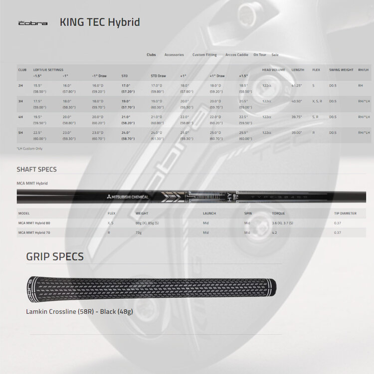 Deze Cobra King Tec hybrides voor heren worden standaard geleverd met de vederlichte Mitsubishi MMT HY80 Graphite Shaft en de fijne Lamkin CrossLine Standard Size grip voor heren.