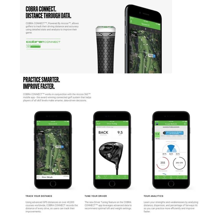 Leuk extraatje is de gratis Arccos sensorset die na aankoop van een Cobra King club of set met QR code op de grip gratis na kunt bestellen bij Arccos zelf. Deze sensor kunt u eenvoudig achterop uw golfclubgrip bevestigen. Vervolgens koppelt u uw Cobra club(s) draadloos met de Arccos App die u gratis download op uw smartphone. U kunt dan 45 dagen gratis gebruik maken van een proefabonnement. Bevalt dat, dan kunt u dit omzetten in een jaarbonnement (€ 146,00).