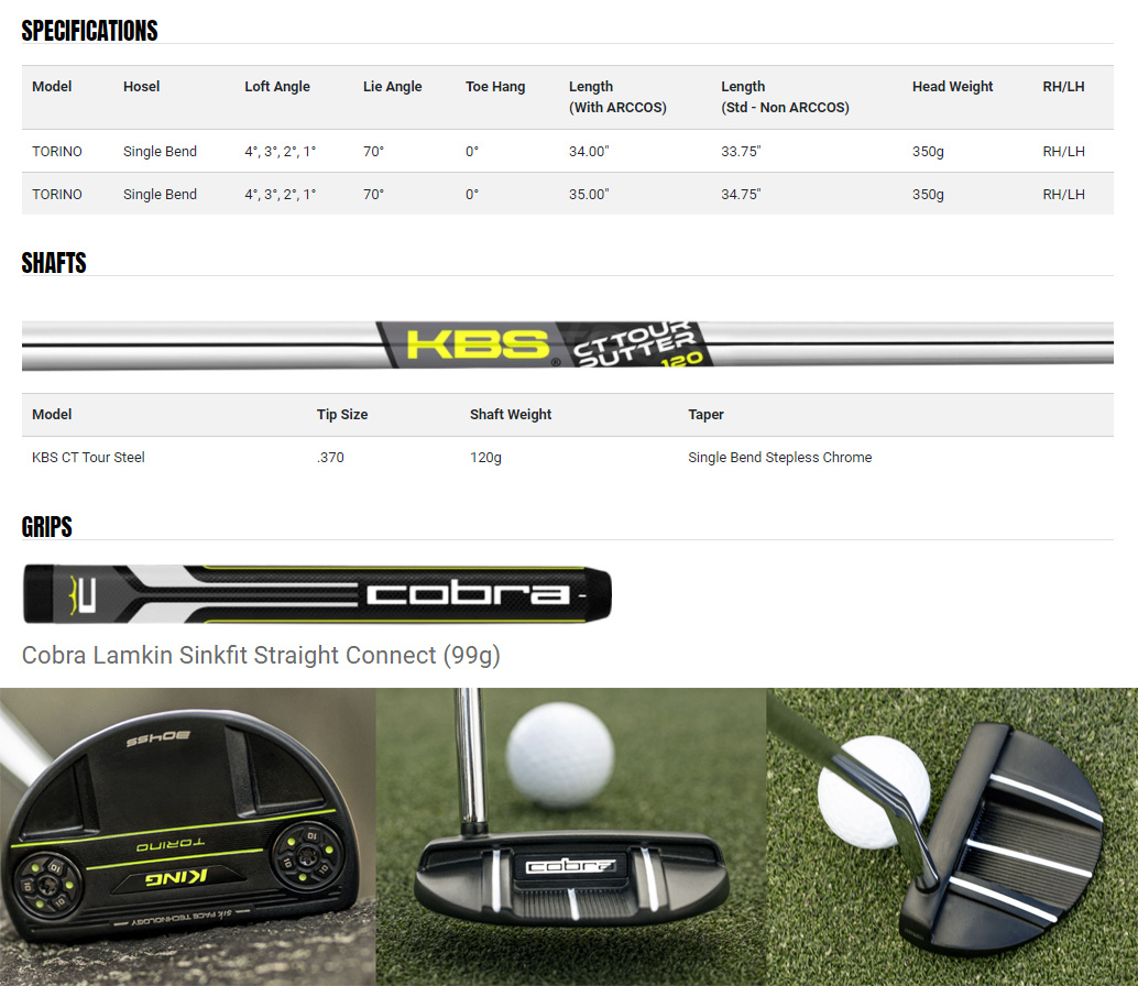 Deze fijne Cobra King Vintage Torino Single Bend Mallet Putter is standaard uitgevoerd met 120 grams KBS CT Tour Putter steel shaft en Cobra Lamkin Sinkfit Straight Connect (99 grams) Putting grip.