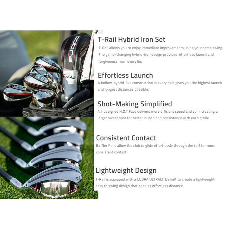 Veel eigenschappen uit de 'normale' ijzers van Cobra zijn geïntegreerd in deze T-Rail serie: Grote clubhoofden met enorme sweetspots gecombineerd met een laag zwaartepunt maken ijzers al erg speelbaar. De Baffler T-Rail techniek, die Cobra al jaren gebruikt in haar hybride clubs en fairway woods, is hier ook in de ijzers gestopt. Hierdoor hebben de clubs veel minder weerstand met de ondergrond dus blijft er veel meer clubsnelheid over. Golf is voor velen een lastige, technische sport waarbij deze Cobra T-Rail 2 hybride ijzers het wat gemakkelijker maken om de bal zonder al te veel technische skills met een wat hogere, voorspelbare balvlucht recht en ver te kunnen lanceren. Hierdoor zijn ze erg geschikt zijn voor beginnende tot enigszins gevorderde golfers (handicap 18-54).