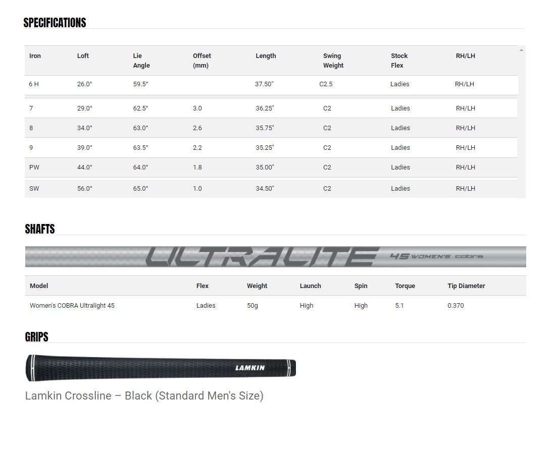 Standaard zijn deze hybride-'graphite-shaft-ijzers' gefit met 45 grams Cobra Ultra Lite graphite shafts en wat dikkere Lamkin CrossLine Standaard grips. Dat laatste zorgt voor minder spanning op de handen dus meer controle.