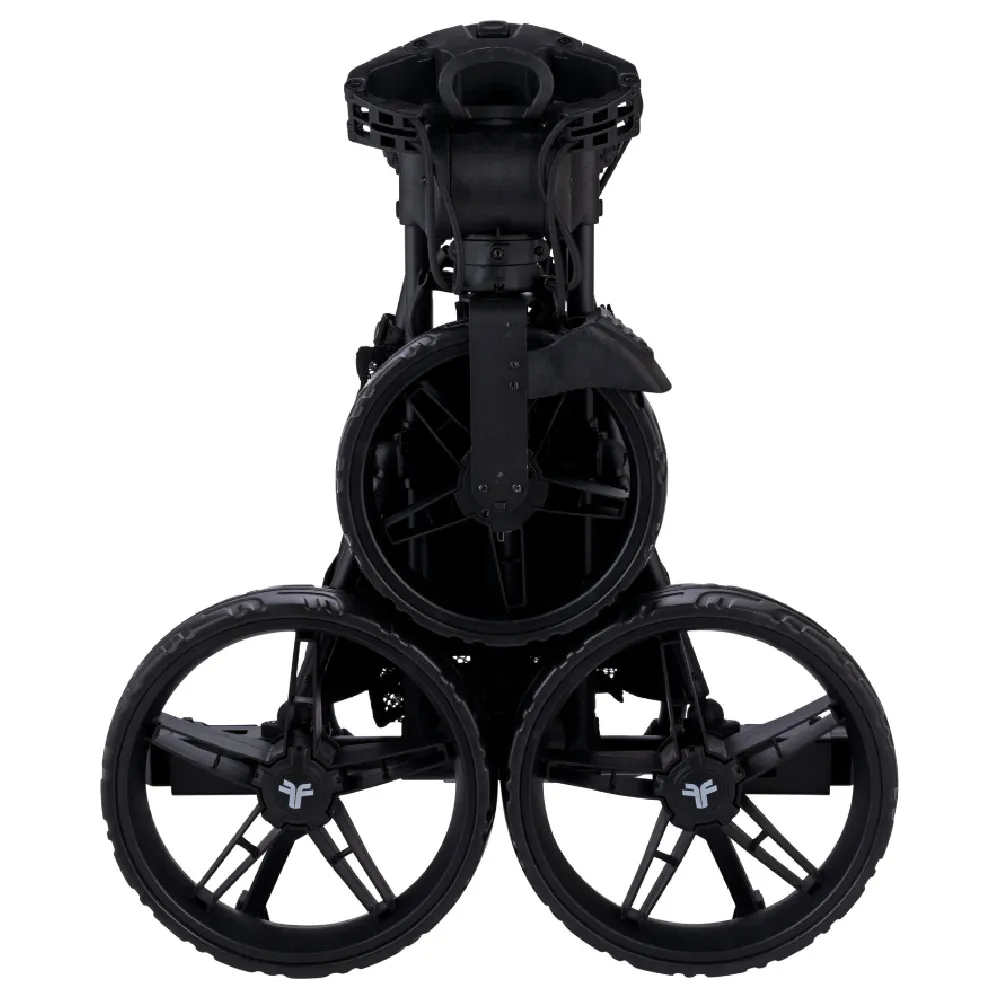 Deze mat zwarte golftrolley met zwarte wielen heet dus de FastFold Compact +. Grootste voordeel aan dit model is het enorme gemak waarmee deze trolley is in te klappen tot een zeer compact pakketje. Deze stevige driewiels golftrolley heeft een opvallend brede wielstand waardoor hij zeer stabiel is. Hij is, naast een aantrekkelijk design, voorzien van een lange lijst met handige details. Voorzien van extra grote 12 inch achterwielen en één 9.5 inch voorwiel.