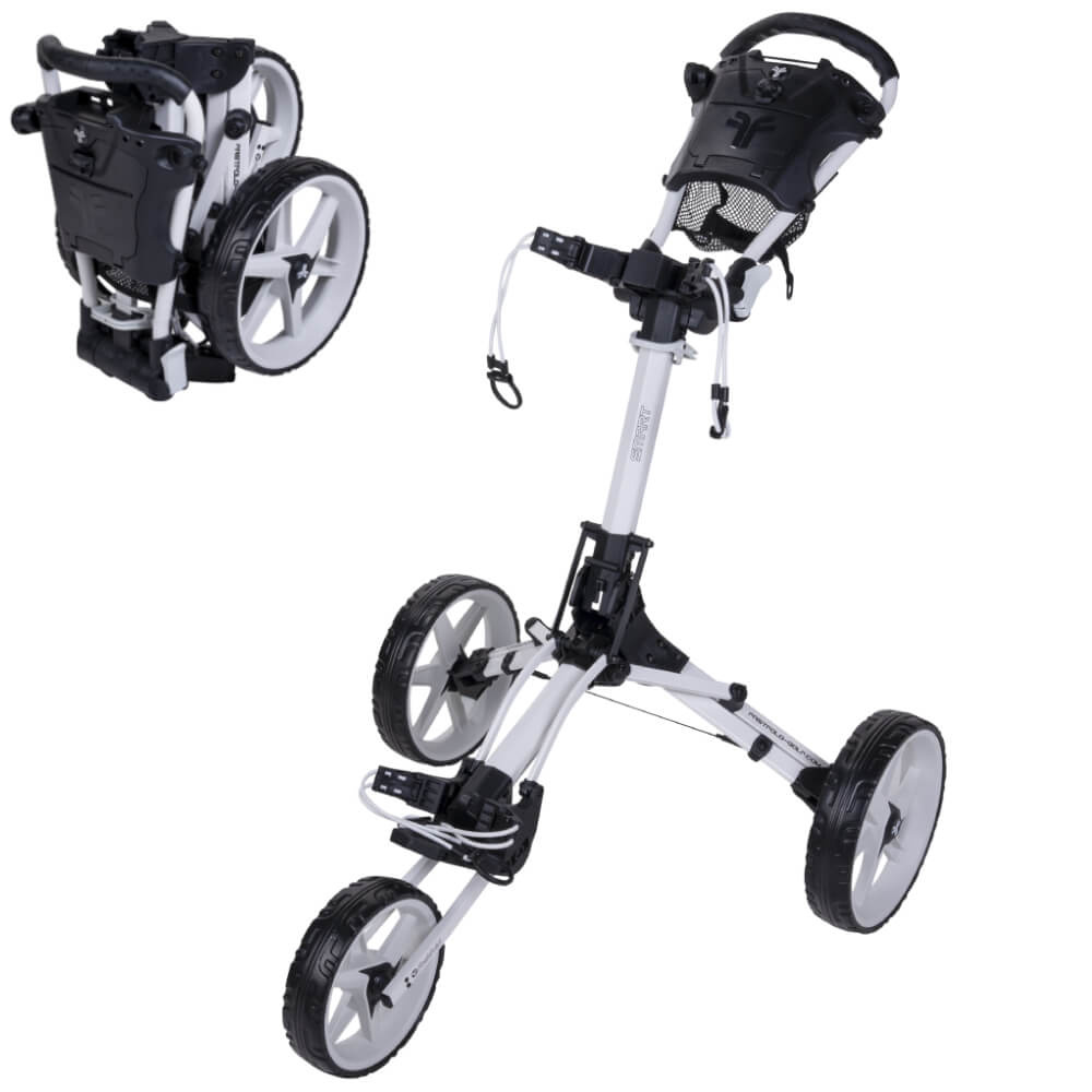 Deze witte golftrolley heet de FastFold Smart. Grootste voordeel aan dit model is het enorme gemak waarmee deze trolley op te klappen is tot een zeer compact pakketje. Deze stevige drie-wiels golftrolley heeft een opvallend brede wielstand waardoor hij zeer stabiel is. Hij is, naast een aantrekkelijk design, voorzien van een lange lijst met handige details zoals het grote, waterdichte opbergvak met scorekaarthouder en de accessoire-houders voor bijvoorbeeld een drinkfles of koeltas. Voorzien van extra grote 12 inch achterwielen en kleiner 9.5 inch voorwiel.