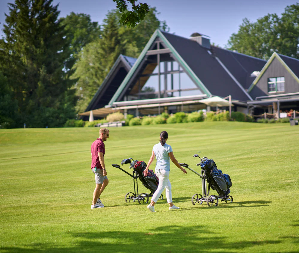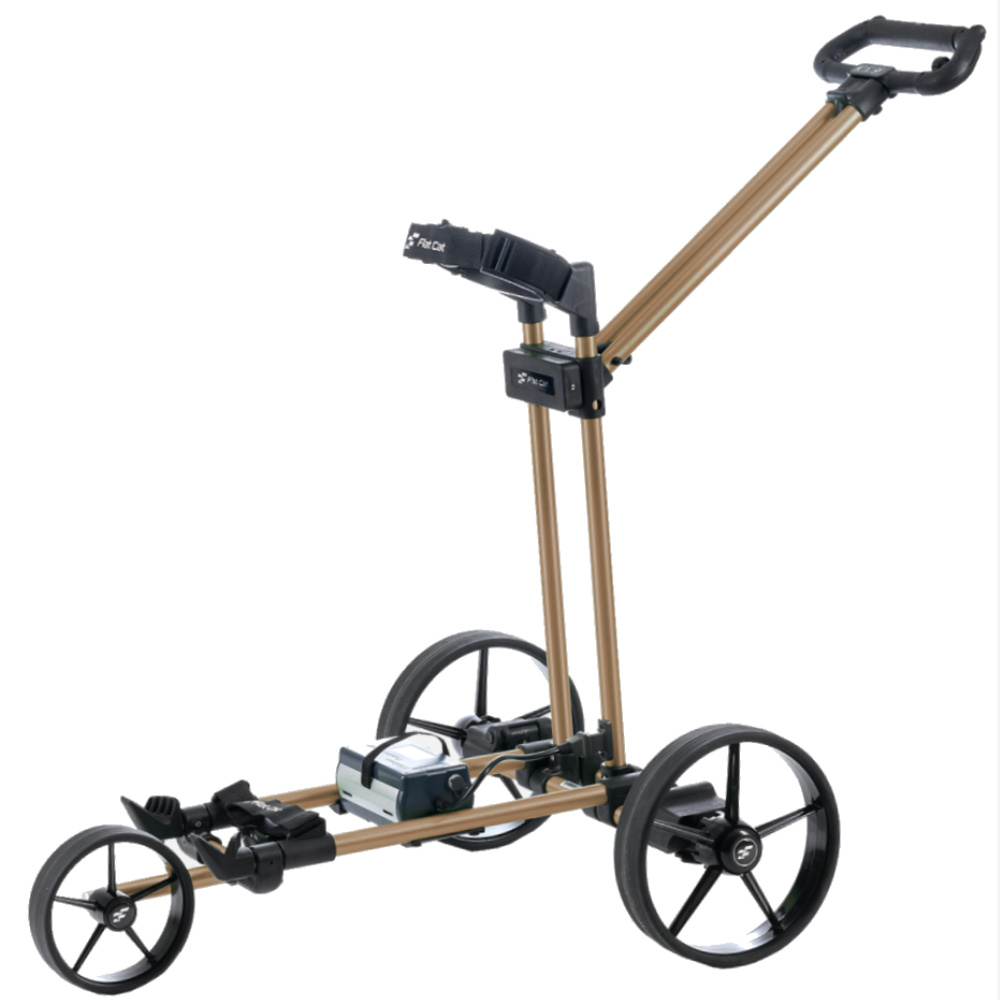Deze luxe, brons metallic gekleurde FlatCat Ahead is voorzien van 2 op de achterwielen gemonteerde motoren die bijzonder stil en krachtig hun werk doen. Zoals gezegd wordt de trolley gestuurd door twee sensoren maar zelf duwen of met de afstandsbediening bedienen kan natuurlijk ook als dat even handiger is. Wat betreft het meegeleverde Lithium accupakket voor deze trolleys kun je 36 holes je gang gaan, prima!