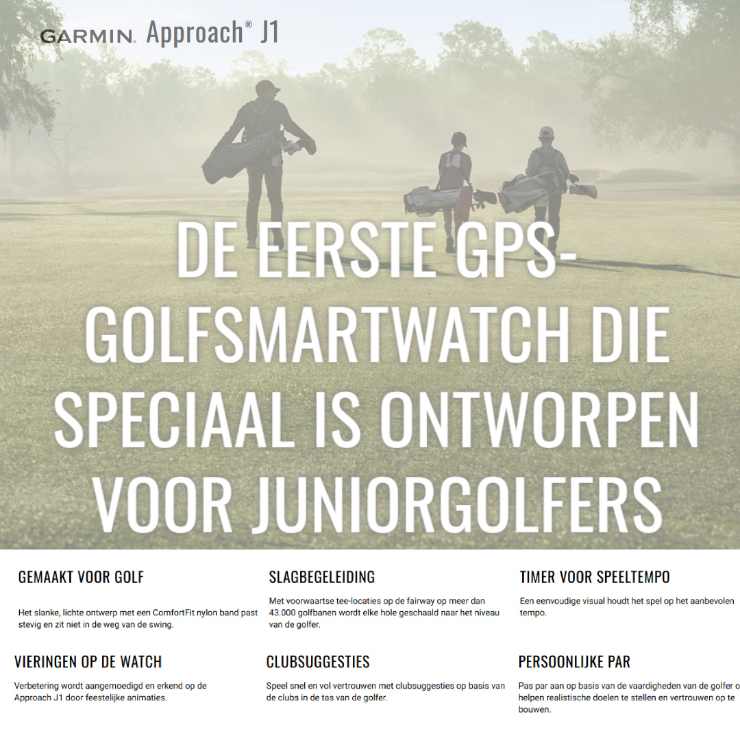 De Garmin Approach J1 is hét GPS-golfhorloge voor junior golfers van 6 tot 14 jaar. Dit model is slank en lichtgewicht, heeft 43.000+ baan-plattegronden en handige tools zoals 'Tee-off begeleiding' om met meer zelfvertrouwen en plezier de baan in te gaan.