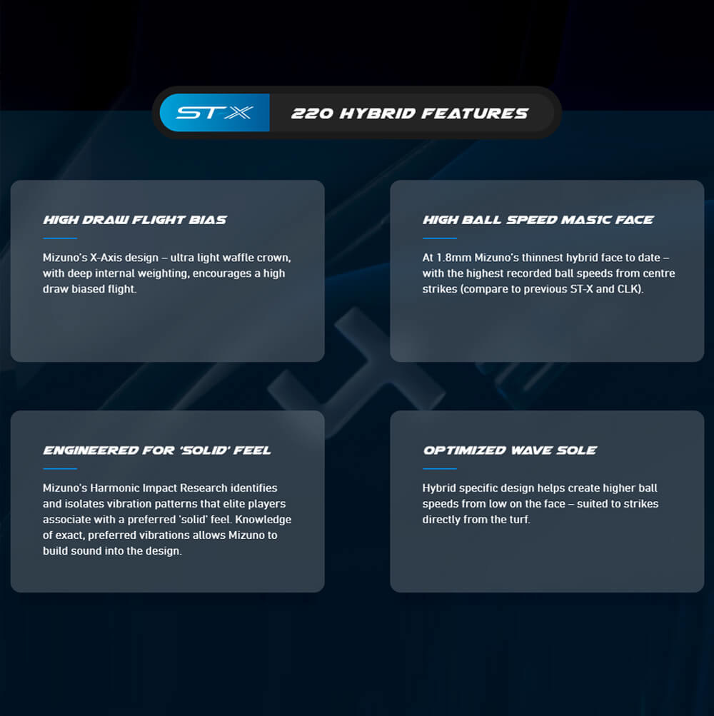 Deze fijne ST-X 220 Hybride Clubs / Rescue clubs zijn standaard gefit met de Mamiya Helium NanoCore 60 graphite shafts maar kunnen op verzoek worden uitgevoerd met de shaft van uw eigen voorkeur. De standaard dames-grip is de Winn+ Wrap Ladies grip.
