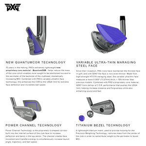 De technische vooruitgang en ontwikkeling waar PXG al meer dan 10 jaar stevig mee aan de weg timmert, brengt grensverleggende golfproducten waar veel golfers prima mee uit de voeten kunnen. Dit is ook zichtbaar en merkbaar aan deze PXG 0311 Gen7 XP ijzers 2024 die blaken van vergevingsgezindheid. Dat gebeurt zowel in de 0311 P als XP variant o.a. met de New QuantumCor Technology. Deze techniek helpt om de massa in het clubblad dusdanig te verdelen dat door de enorm hoge MOI (Moment Of Inertia) de vergevingsgezindheid naar een extreem hoog niveau wordt getild. Samen met het Variable Ultra-Thin Maraging Steel Face (variabele slagvlakdikte) en de Power channel Technology is het clubhoofd in staat om energie maximaal over te brengen op de balsnelheid zonder betrouwbaarheid te verliezen. Ook de voor PXG zo kenmerkende Titanium Bezel Technology en Tungsten Weighting, voor positionering van gewicht op de plekken waar het het meest voor u doet. Die gewichtsverdeling is bij modern golfmateriaal steeds belangrijker geworden in de strijd om controle en vergeving en dat is gelijktijdig ook het grootste verschil tussen de twee P en XP Gen7 ijzervarianten. Alle ijzers zijn 5 x gesmeed (Forged) waardoor je bij deze clubs een boterzacht balcontact ervaart zonder extreme slijtage aan de gelaserde groeven in het sterk geharde staal.
