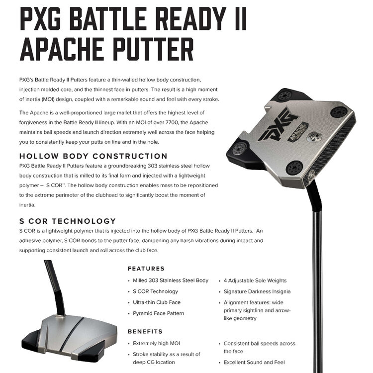 Deze PXG Battle Ready-2 Apache Putter 2023 is voorzien van de PXG Straight Puttershaft en Lamkin PGX SinkFit Pistol puttergrip en Double Bend shaft aansluiting op het clubhoofd.
