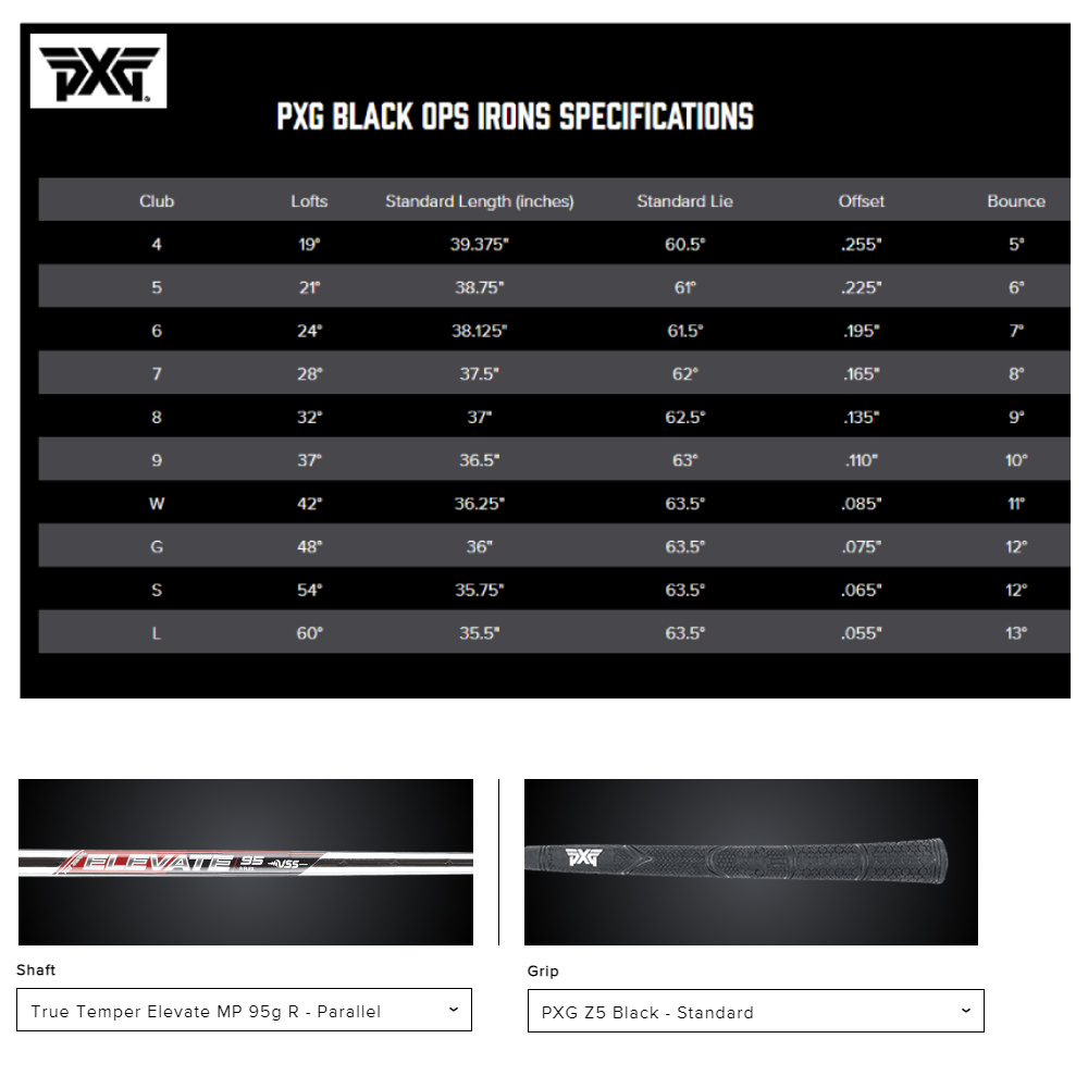 Deze PXG Black Ops ijzers zijn standaard uitgevoerd met KBS Tour 110 Gram regular flex steel shafts en Lamkin PXG Z5 Black standaard herengrip.