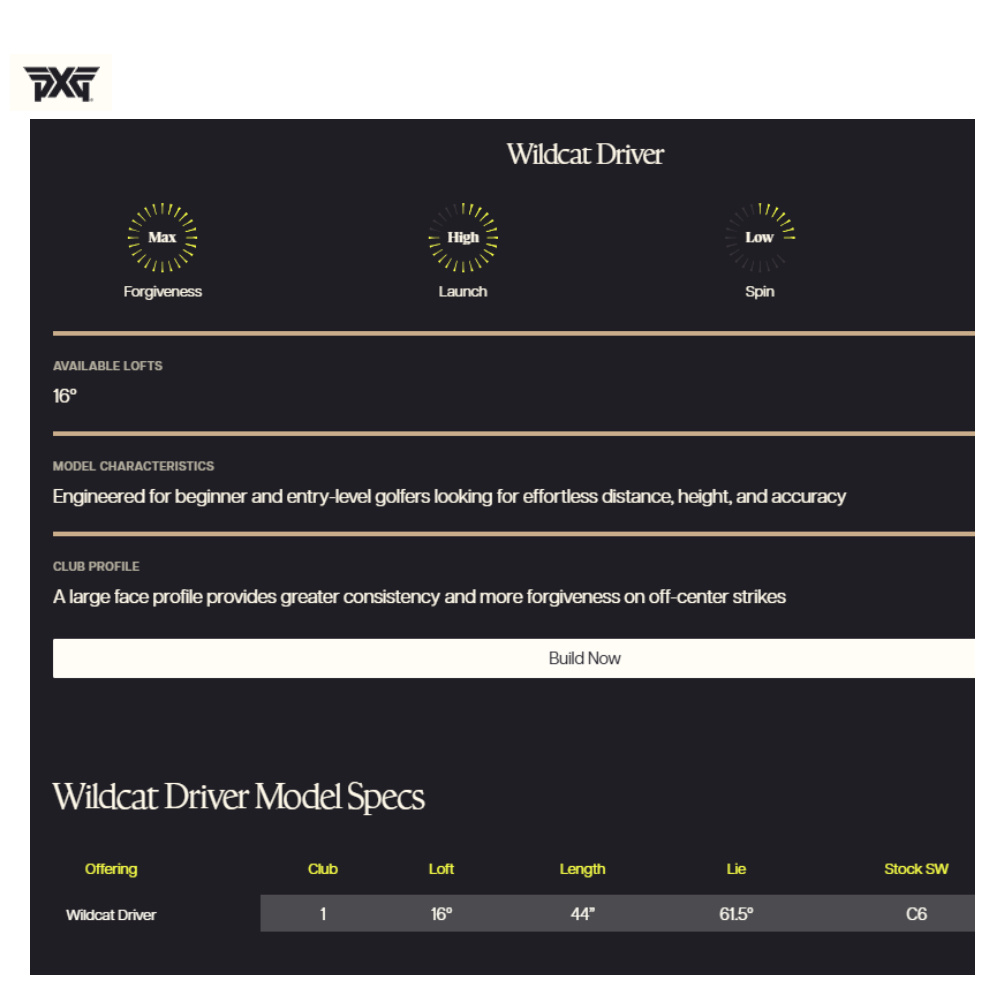 De vergevingsgezinde PXG Wildcat driver heeft dus een hogere loft om de bal gemakkelijk de lucht in te krijgen waarbij het Titanium clubface de balsnelheid maximaliseert. 'Precision Weighting' zorgt daarbij voor een optimale balans en laag zwaartepunt wat de prestaties en het speelgemak ten goede komt. De club is eenvoudige speelbaar en het Fixed Loft concept garandeert eenvoud en doelmatigheid.