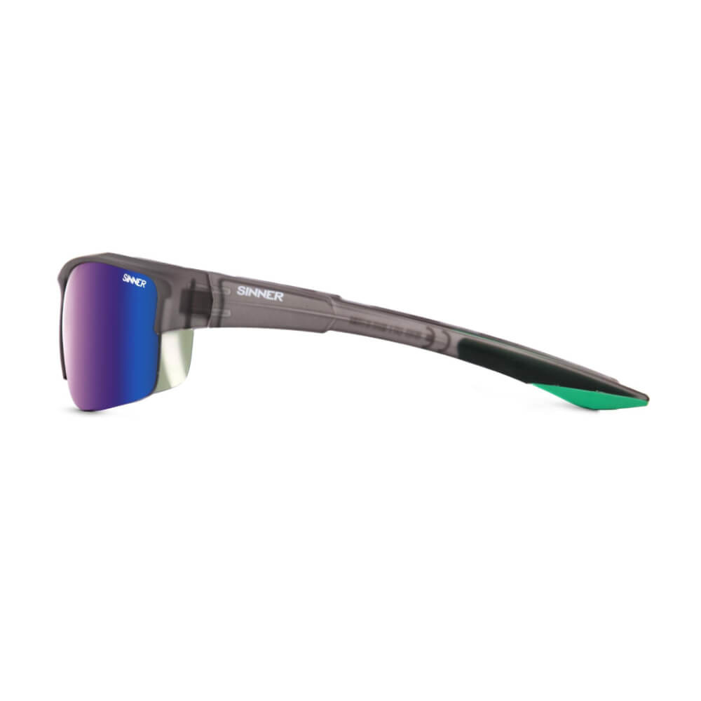 Dit is de Sinner Reyes Sportstyle zonnebril met mat grijs frame en spiegelende, gepolariseerde (categorie 3) lenzen. De lenstechnologie zorgt er voor dat 100% van het UV licht wordt geblokkeerd, erg comfortabel voor de ogen. Deze Bril is voorzien van rubberen neuspads en flexibele uiteinden van de brilpootjes. De roestvrijstalen schanieren zijn intergraal in het frame verwerkt.