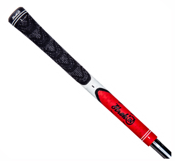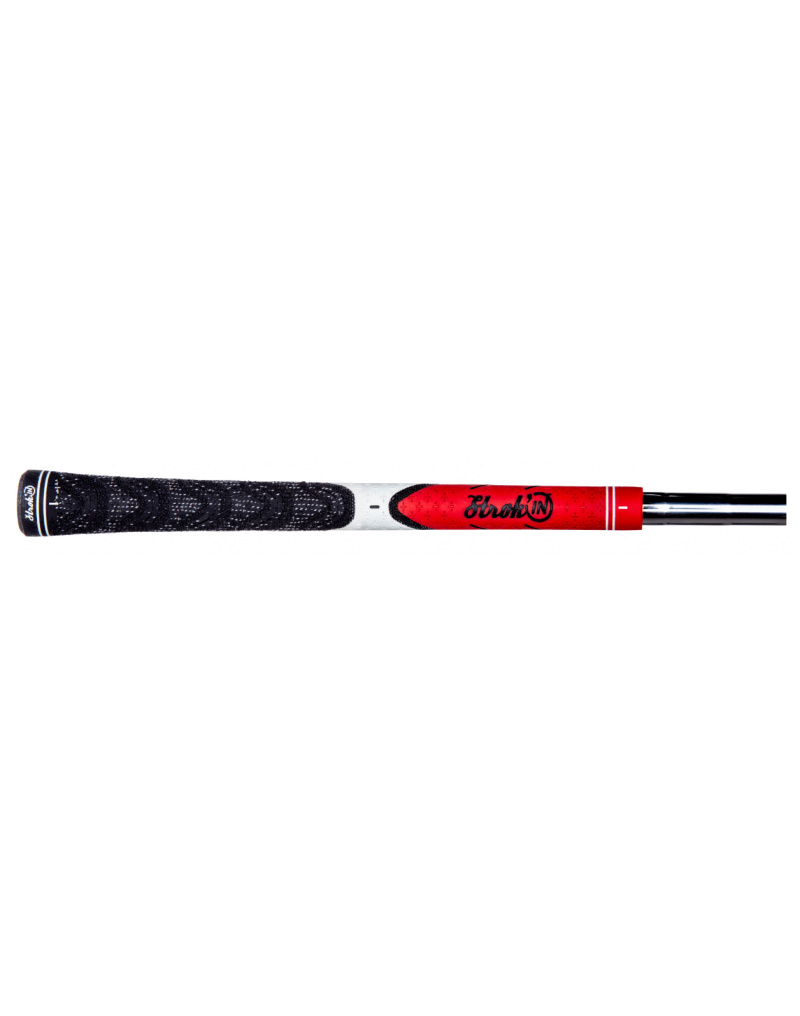 Dit is de zwart-rode V-Grip Project Cord grip van Stroke'IN in standaard heren maat, geschikt voor al uw golfclubs. Voelt enigszins stroef aan door de ingeweven Cord (draad) in het onderste deel.