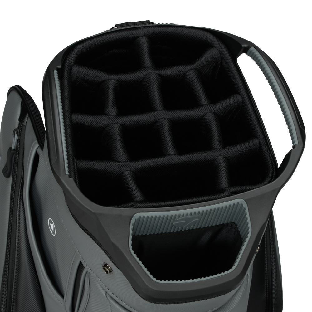 Met een vernieuwd 2026-design is deze TaylorMade DeLuxe Cartbag 2026, uitgevoerd in zwart-grijs, een lust voor het oog. Ook de kwaliteit en uitstraling zijn uitstekend dankzij sterk, waterafstotend synthetisch leder, veel opbergruimte en een 14-vaks top.