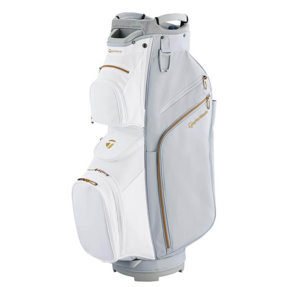 Dit is de prachtige TaylorMade Kalea Gold Ladies Cartbag in grijs wit met de opvallend chique, goudkleurige ritsen. Hij is perfect passend bij de vormgeving en het materiaalgebruik van de Kalea Gold dames golfclubserie. Kalea is speciaal ontworpen om te voldoen aan de behoeften van de vrouwelijke golfspeler die valt voor vormgeving en kwaliteit. TaylorMade heeft deze lichtgewicht tas voor op de trolley 11 opbergvakken gegeven, aangevuld met een hele serie praktische handigheidjes.