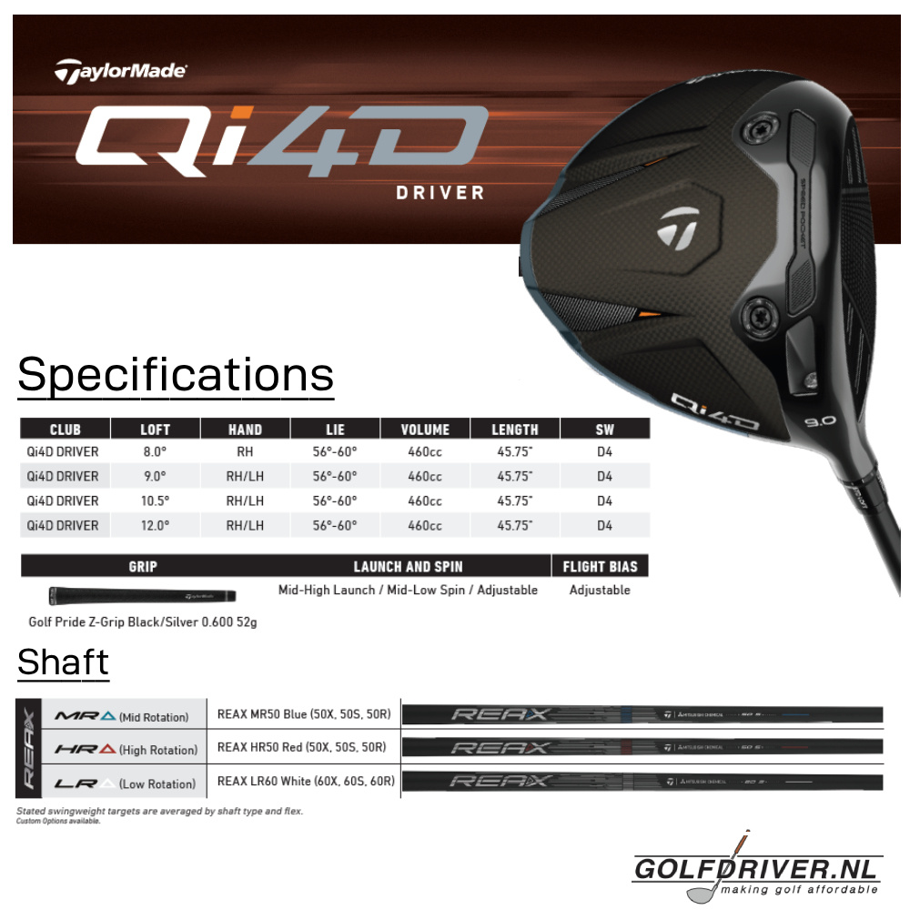 Voor seizoen 2026 introduceerde TaylorMade de QI4D Driver waarbij deze 'basic' versie qua balans en specificaties de gulden middenweg vertegenwoordigt. TaylorMade gooit met deze serie wederom hoge ogen waarbij voor deze versie de doelgroep uiteen loopt van licht gevorderde tot ver gevorderde, single handicap golfers. Meer stabiliteit en stuurbaarheid maken hem niet alleen beter speelbaar maar ook krachtiger. Dankzij innovaties als een doorontwikkeld Carbon slagvlak en de stabiliteit verhogende 10K M.O.I. (Moment Of Inertia) is deze allemansvriend interessant voor nagenoeg iedere serieuze golfer. Het indrukwekkende design is krachtig, modern en Hightech. In de QI4D serie zijn anno 2026 verschillende varianten verkrijgbaar waarvan deze QI4D het meest allround is.
