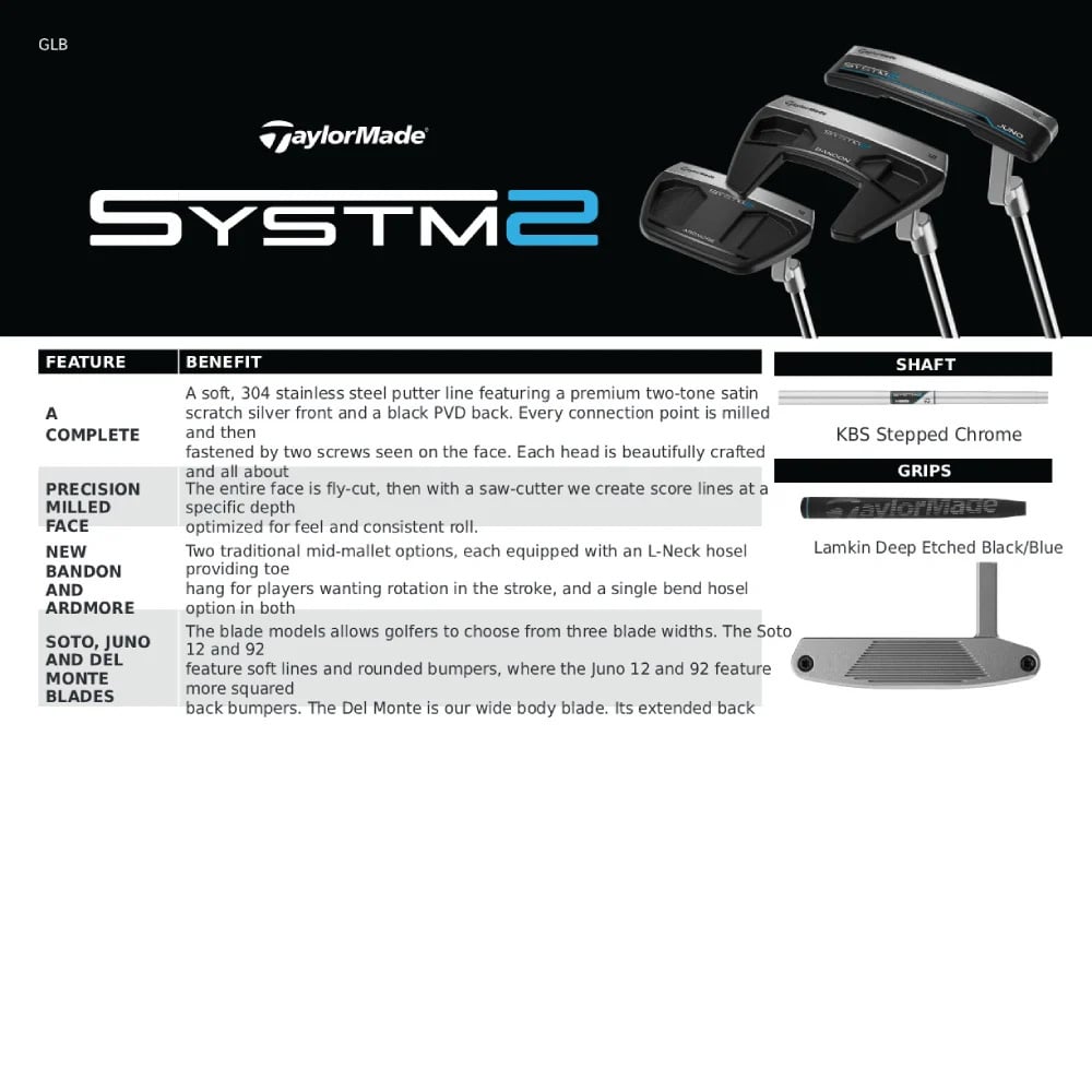 Deze TaylorMade SYSTM2 Soto 2026 Putter is voorzien van de KBS Steped Chrome Puttershaft (120 gram) met een fijne, licht ververdikte Lamkin Deep Etched puttergrip. De Slant shaft aansluiting op het clubhoofd maakt hem Face Ballanced.