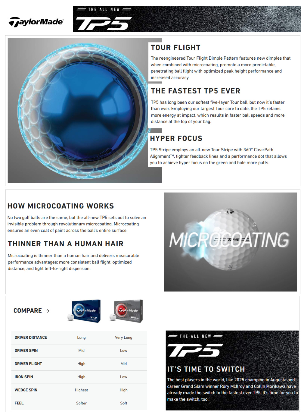 Gericht op de veeleisende golfer brengt Taylormade anno 2026 de verbeterde TP5 golfballen. De filosofie: een vijf-laag ontwerp, een urethaan cover voor feel en greenside spin, en een geoptimaliseerd dimplepatroon voor stabiele vlucht en maximale afstand.