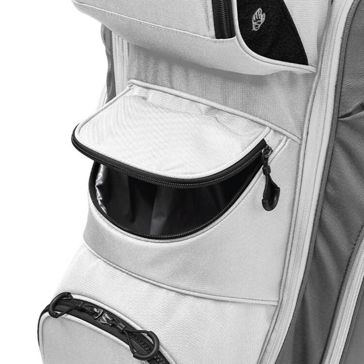 Prachtig vormgegeven, zeer stevig, vol handige details en toch vederlicht: deze grijs witte Wilson i-Lock 2025 trolley cart bag. Prachtig gemaakte, complete premium golftas met fijn anti-rammel top-element.