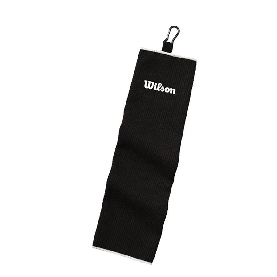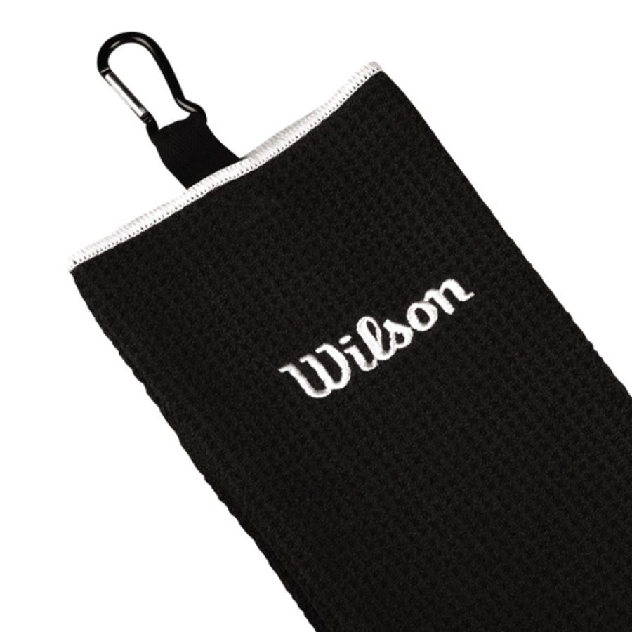 Dit is de Wilson Trifold 100% Microfiber katoen golfhanddoek met keurig afgewerkte, geborduurde rand.